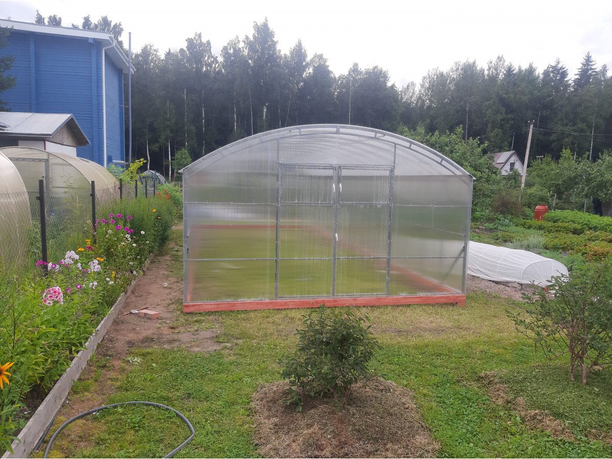 • широкая 4 м, ширина теплицы позволяет организовать 3 широкие полноценные грядки с комфортными проходами между ними;